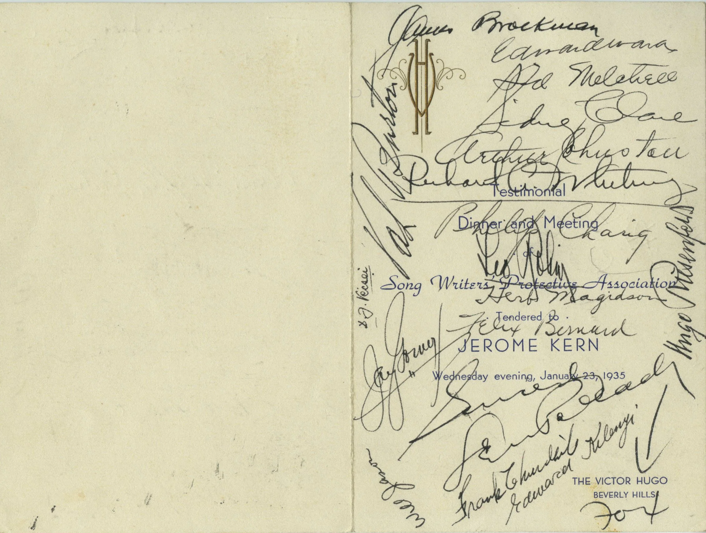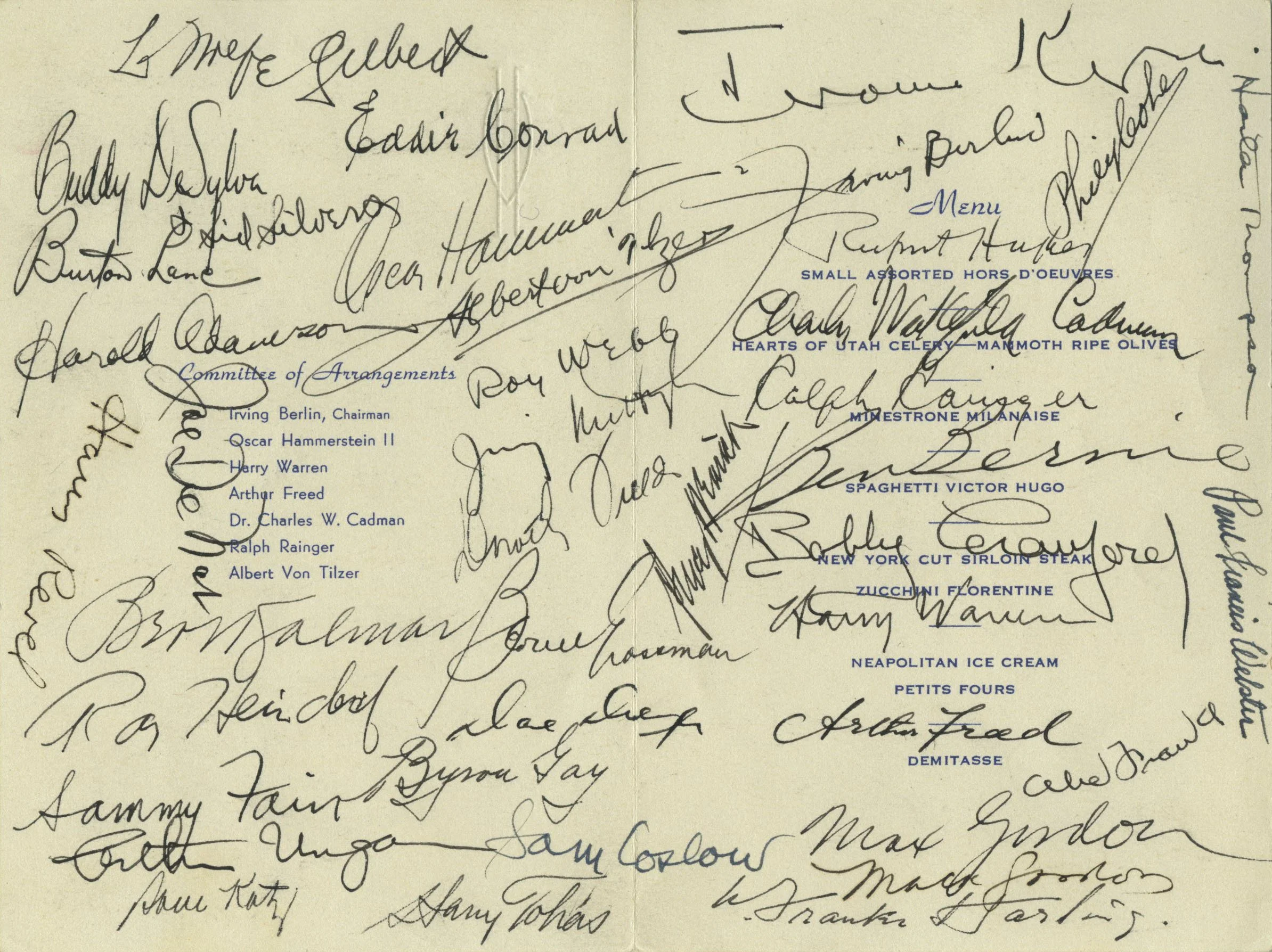 Signed program and menu from the Song Writers’ Protective Association Event honoring Kern