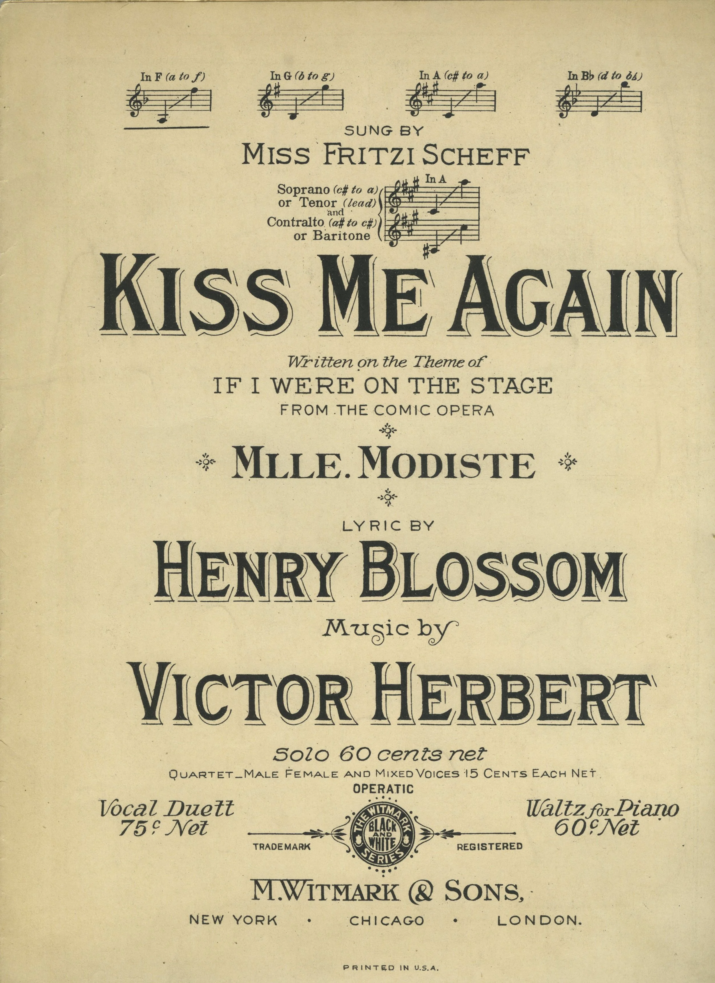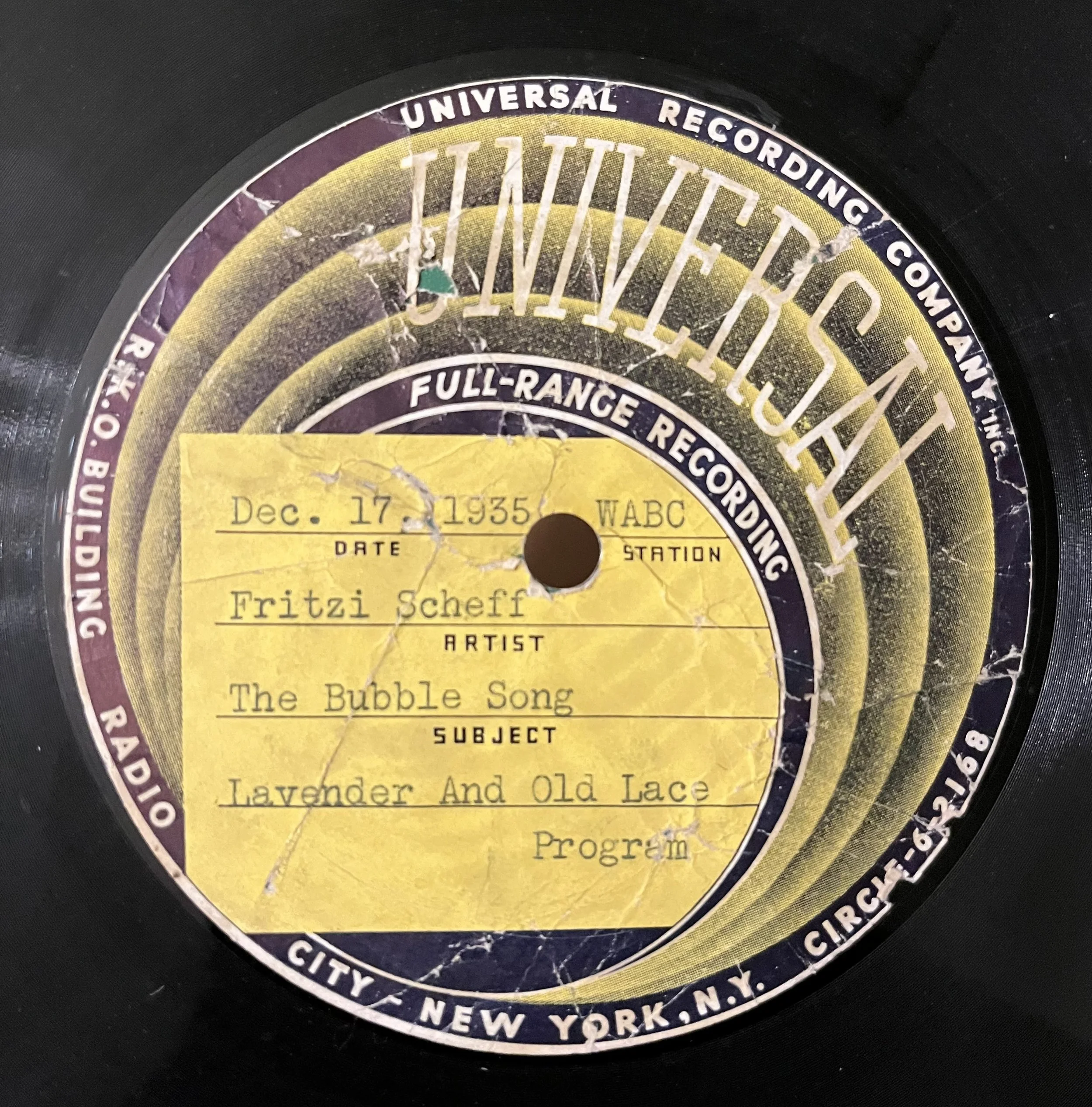 Radio transcriptions of Fritzi Scheff singing “Kiss Me Again” from Mlle. Modiste, “The Bubble” from Rudolf Friml’s High Jinks, and “Wine, Woman and Song” by Johann Strauss, Jr.